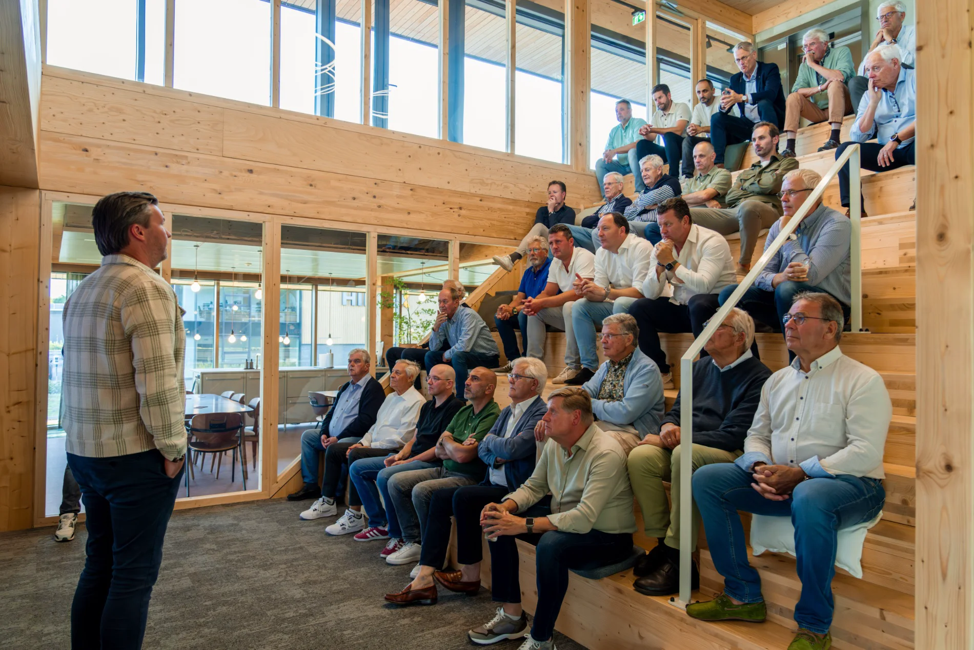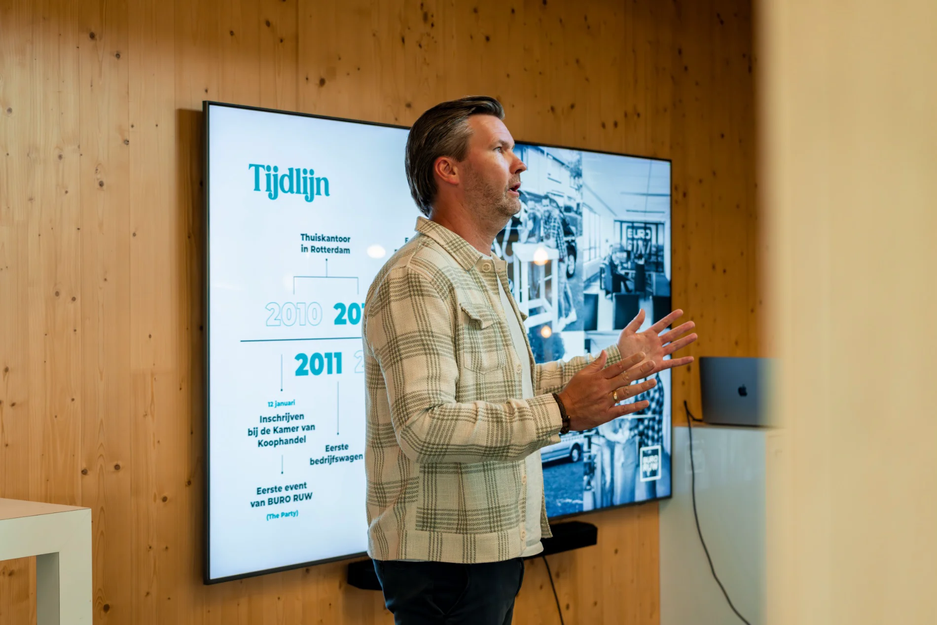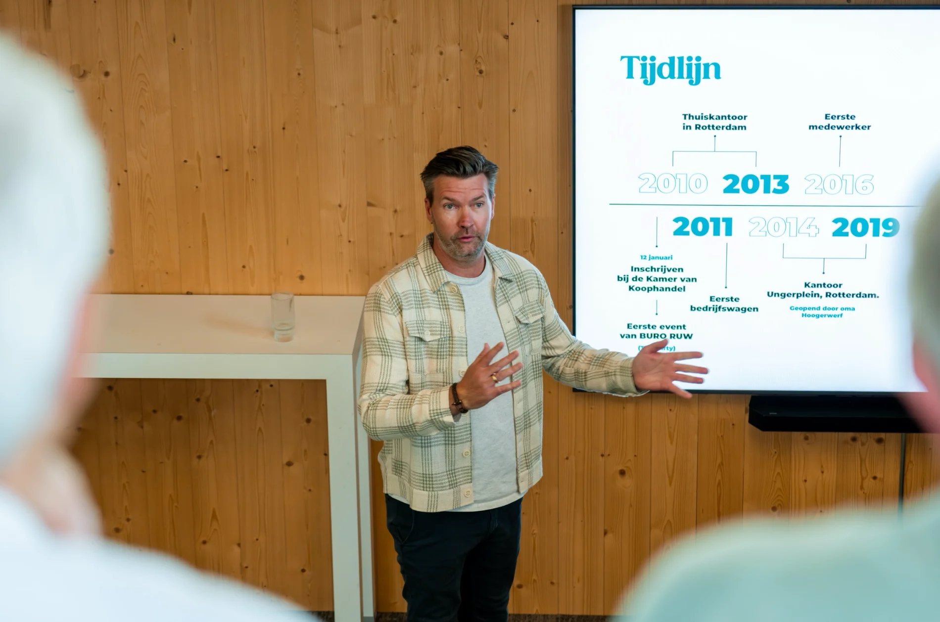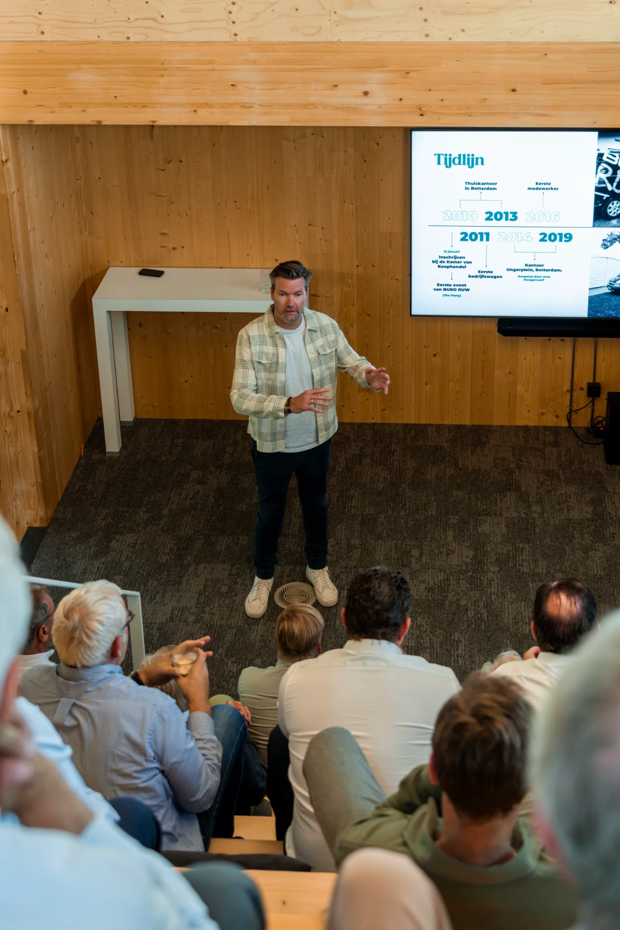 Voorzitter Walter had de eer om de avond te openen, wat dit bedrijfsbezoek voor hem extra speciaal maakte. Hij vertelde kort over het doel van de avond, waarna Rutger een persoonlijk en inspirerend verhaal deelde over 15 jaar BURO RUW: een reis vol creativiteit, groei en lef. V